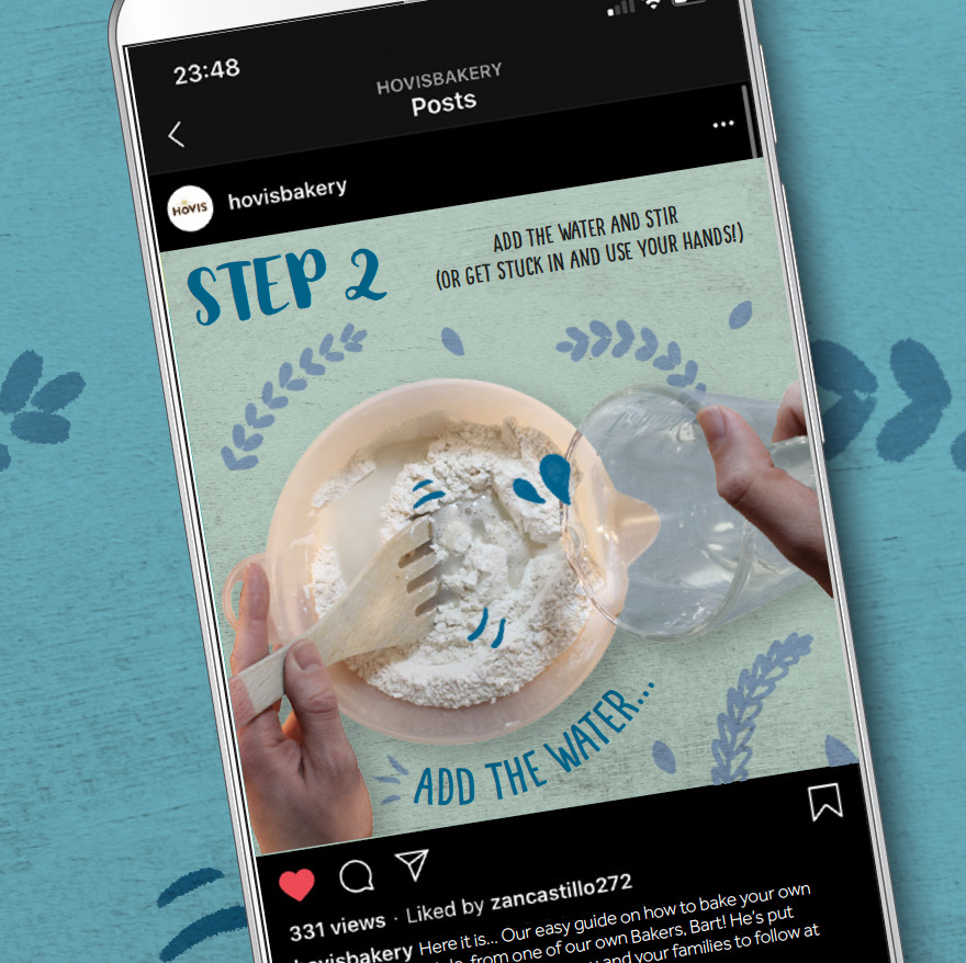 Hovis® briefed us to create an animated step by step guide to inspire baking bread during this new found time at home. The animation could be discovered on Hovis’ instagram and facebook pages. We used a combination of illustration, photography and textural elements to form a fun collage style effect. The photography was key, to ensure the instructions were as easy to follow as possible.